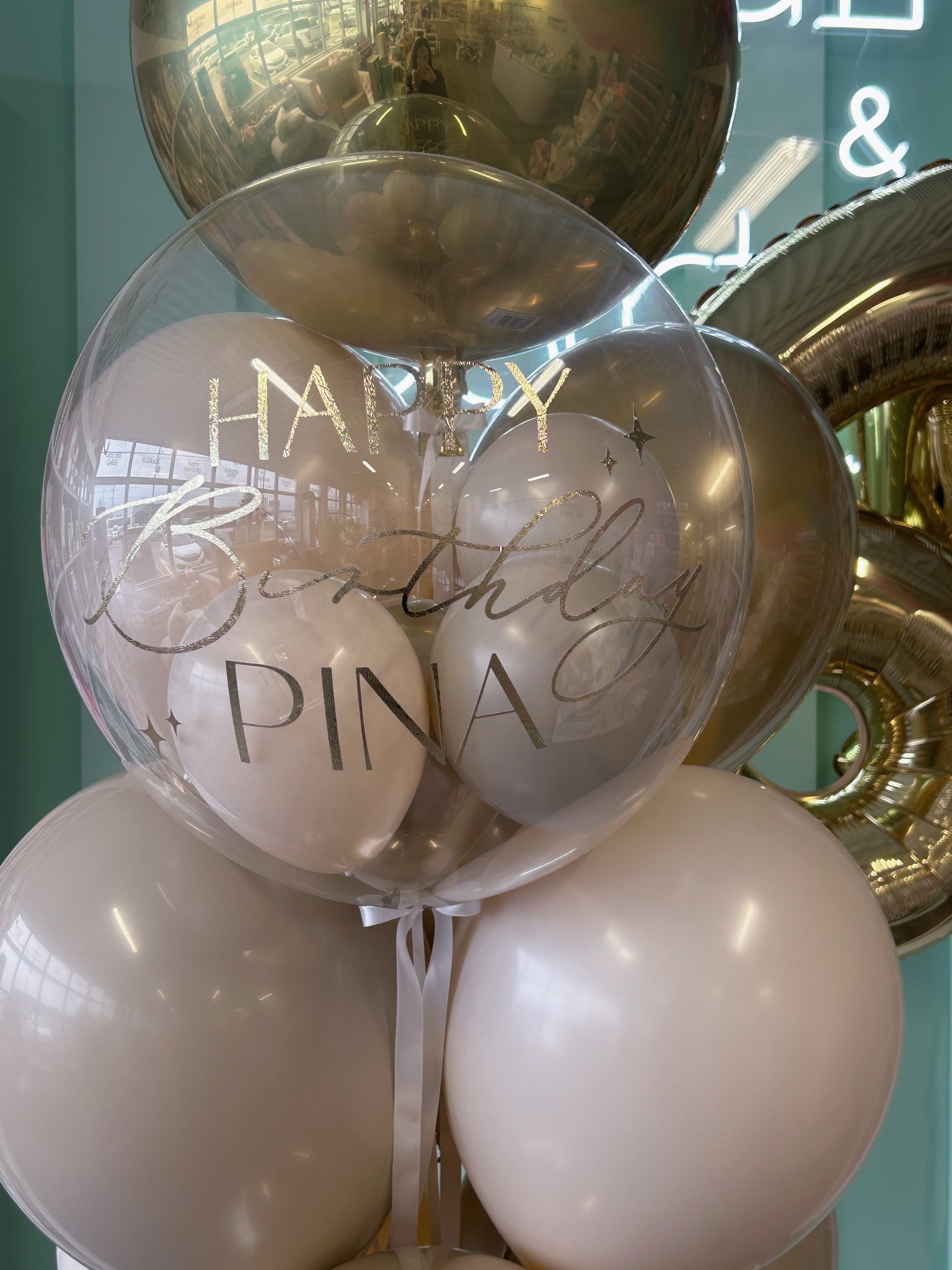 Celebrate in elevated style with this neutral luxe birthday balloon bundle, featuring a personalized clear bubble balloon for a truly custom touch 🤍✨