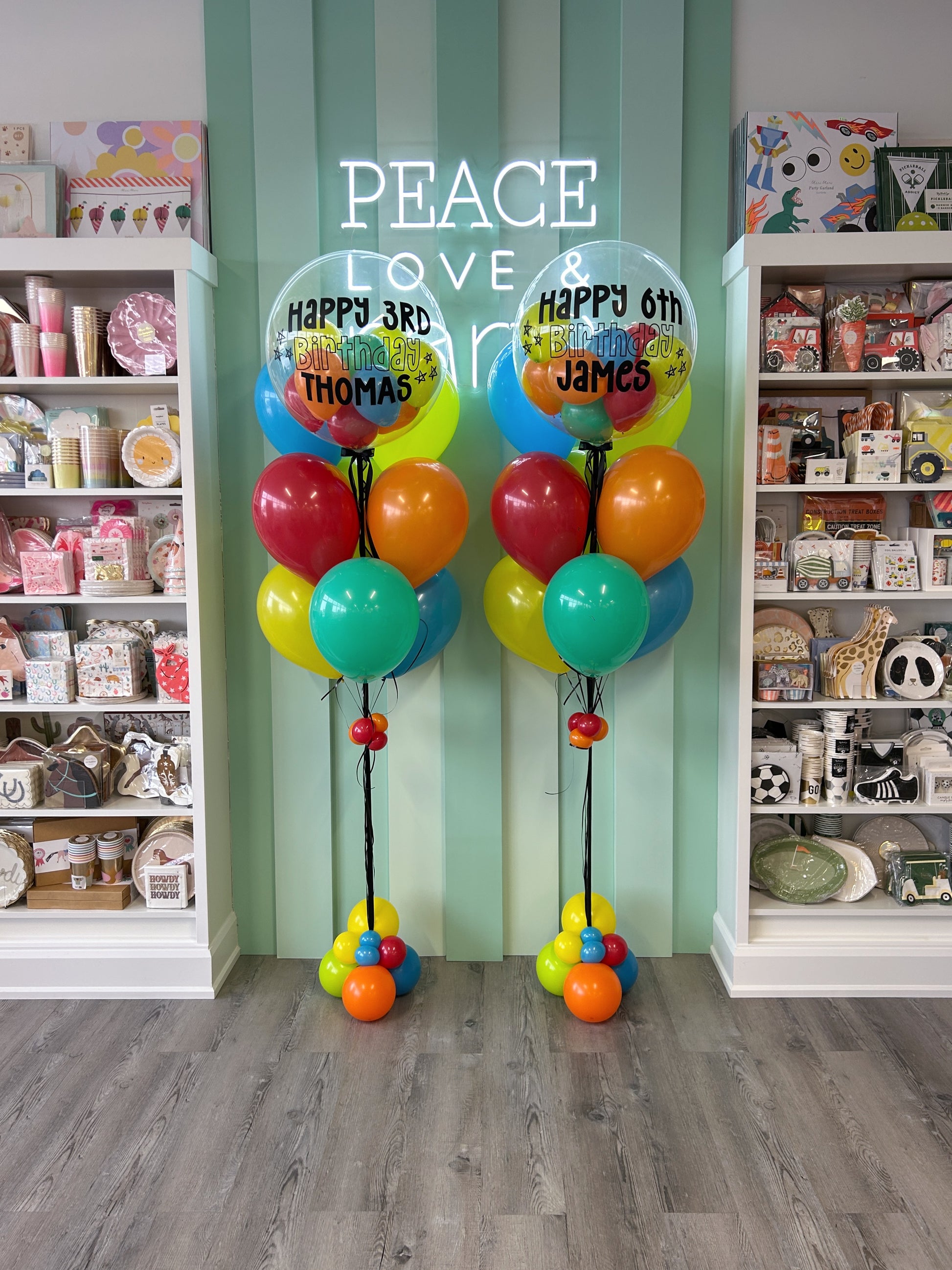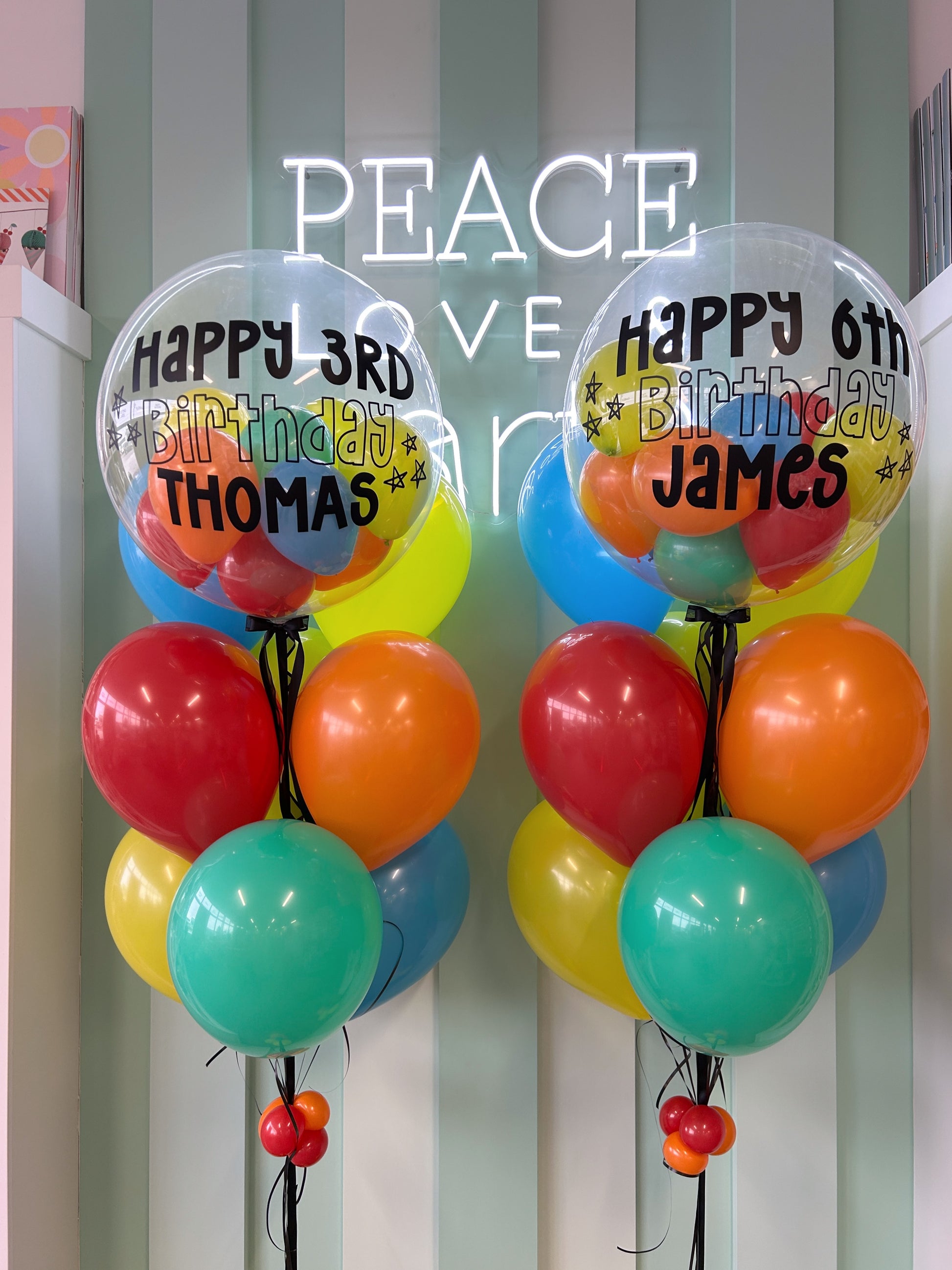 Bright, bold, and made to celebrate - our Personalised Rainbow Bubble Pop is a fun statement piece for kids’ birthdays of any age.This design features a clear bubble balloon filled with colourful balloons and personalised with a custom birthday message and name. The bubble is paired with a vibrant mix of classic latex balloons and finished on a sleek balloon stand with a coordinating balloon base.