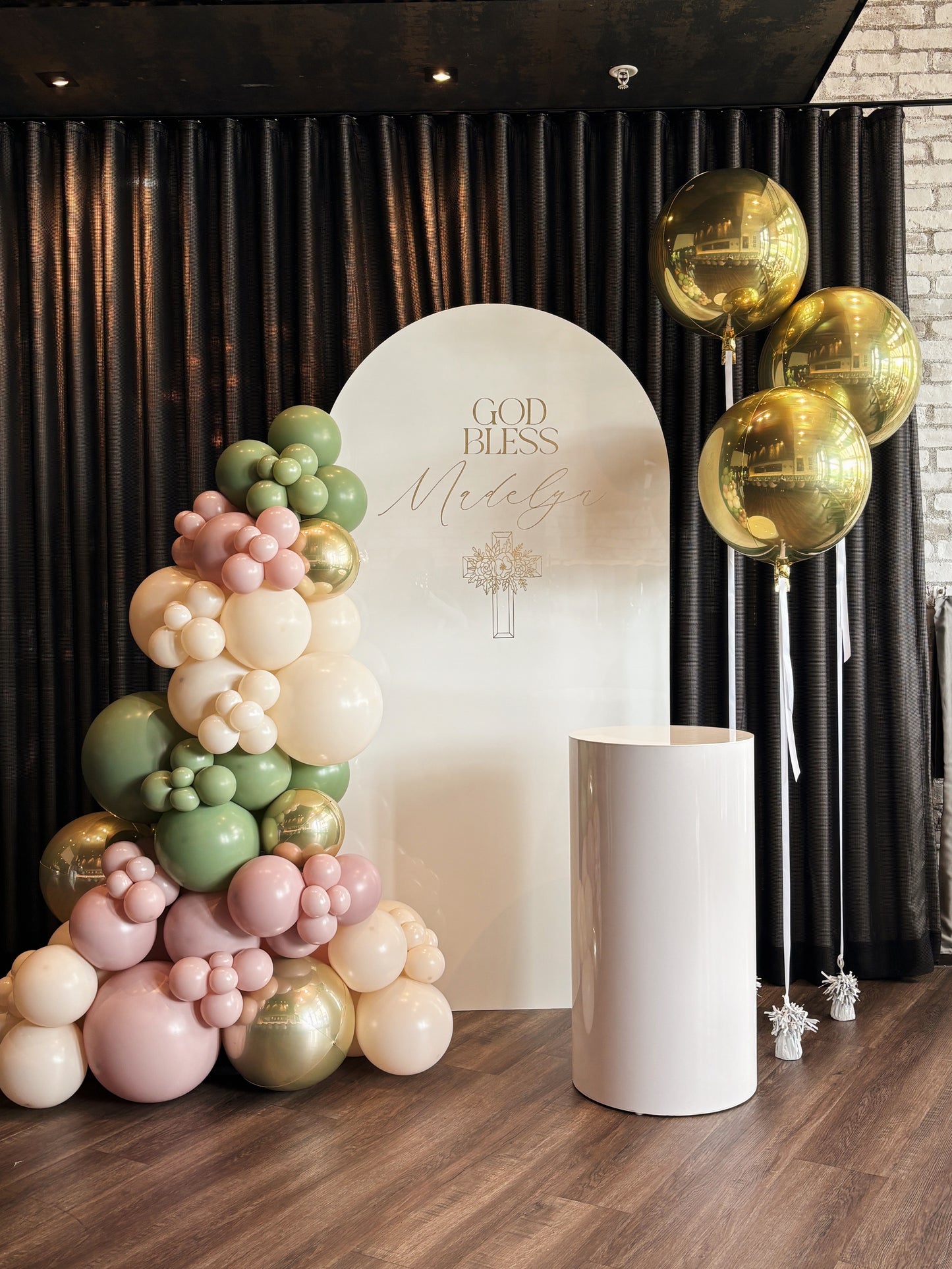 Elevate your celebration with our Sacrament Balloon Garland set! Featuring a personalized panel backdrop, white acrylic cake plinth, and three gold Orbz, this chic and sophisticated design adds simplicity and style to any special occasion ✨